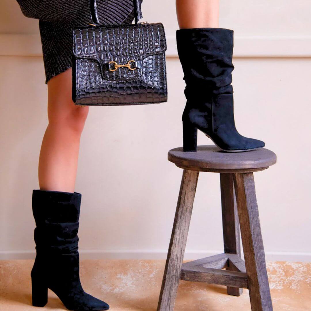 Casandra es confeccionada a mano en piel de alta calidad, su caña se pliega de forma natural, creando un drapeado fluido que aporta movimiento y carácter al diseño.